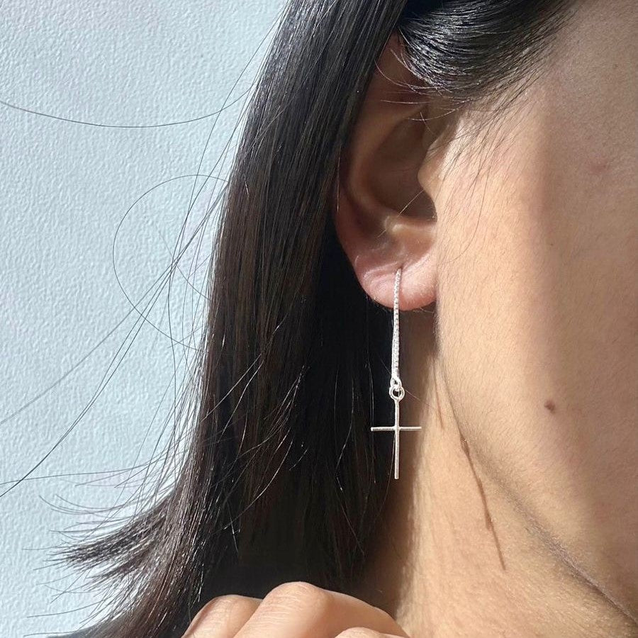 Add a touch of playful, modern art to your look with the Coss shaped Threaders. This pair features a cross shape on a delicate thread-through chain. They are a unique and creative accessory for the modern minimalist.