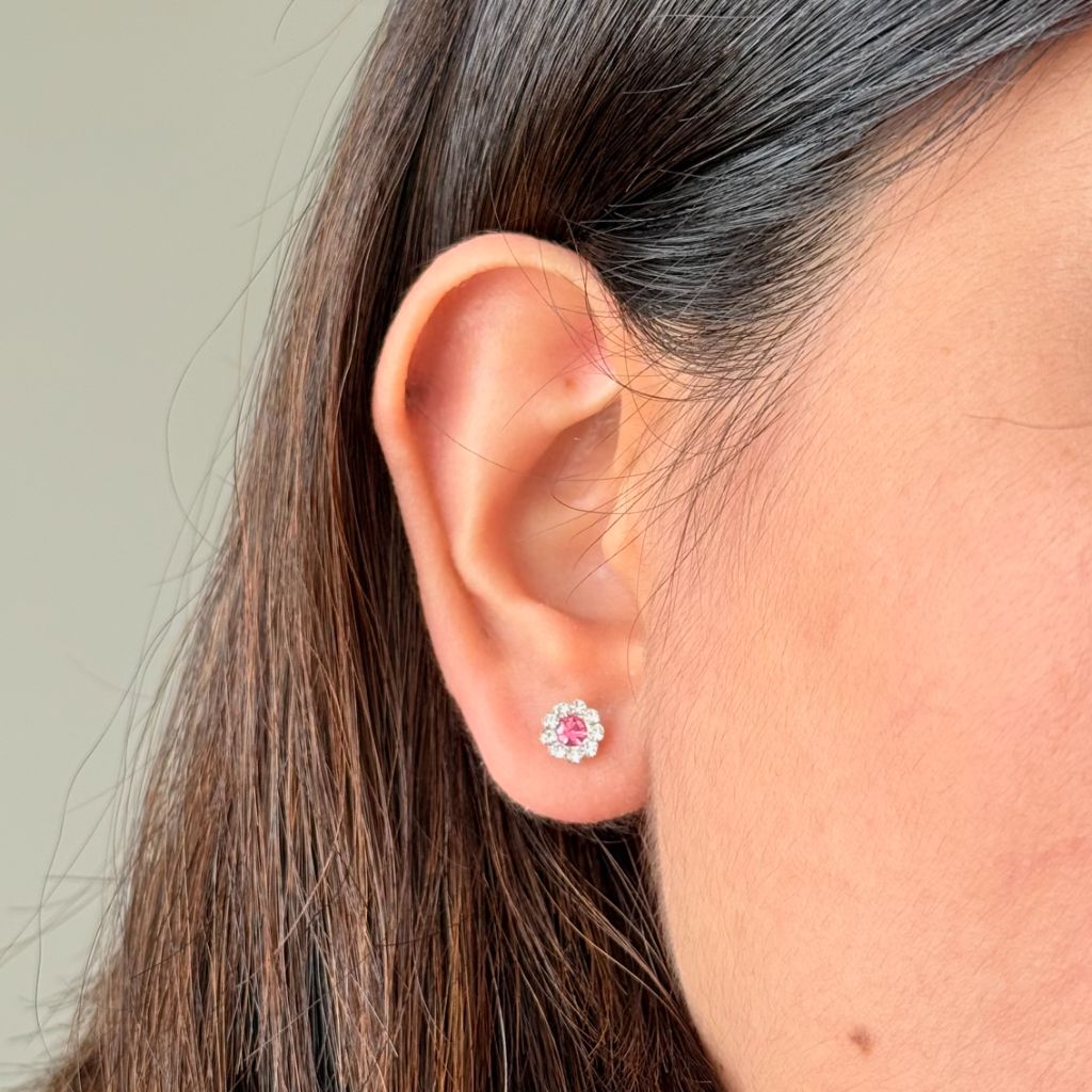 Celebrate intricate beauty with the Dahlia Stud Earrings. Inspired by the geometric petals of the dahlia flower, this pair features a stunning, detailed floral design. Available in sparkling white or delicate pink zircon, they are a masterpiece of feminine charm.