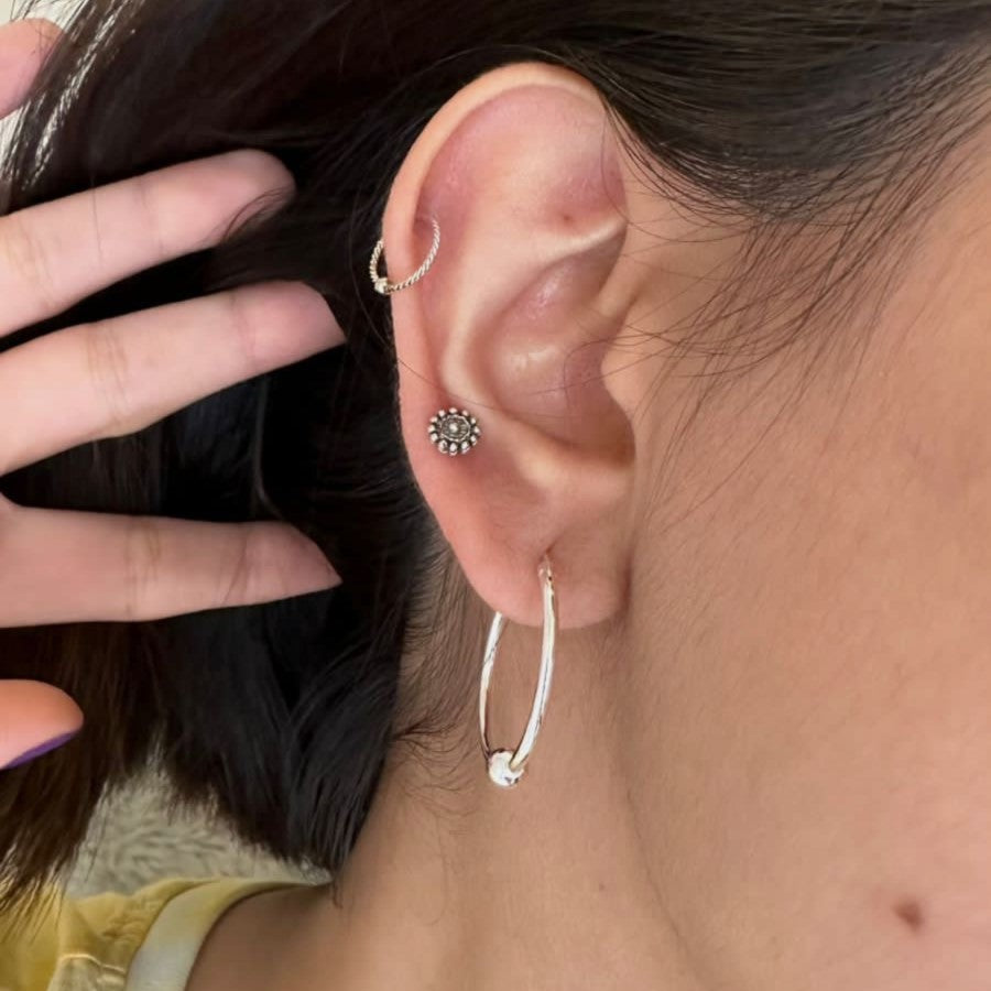 The Dorothea Hoop is a statement of delicate strength. Whether as a chain or a hoop, its unique and intricate pattern stands out, offering a blend of vintage charm and modern sensibility. Wear it to add a touch of texture and sophisticated detail to your look.