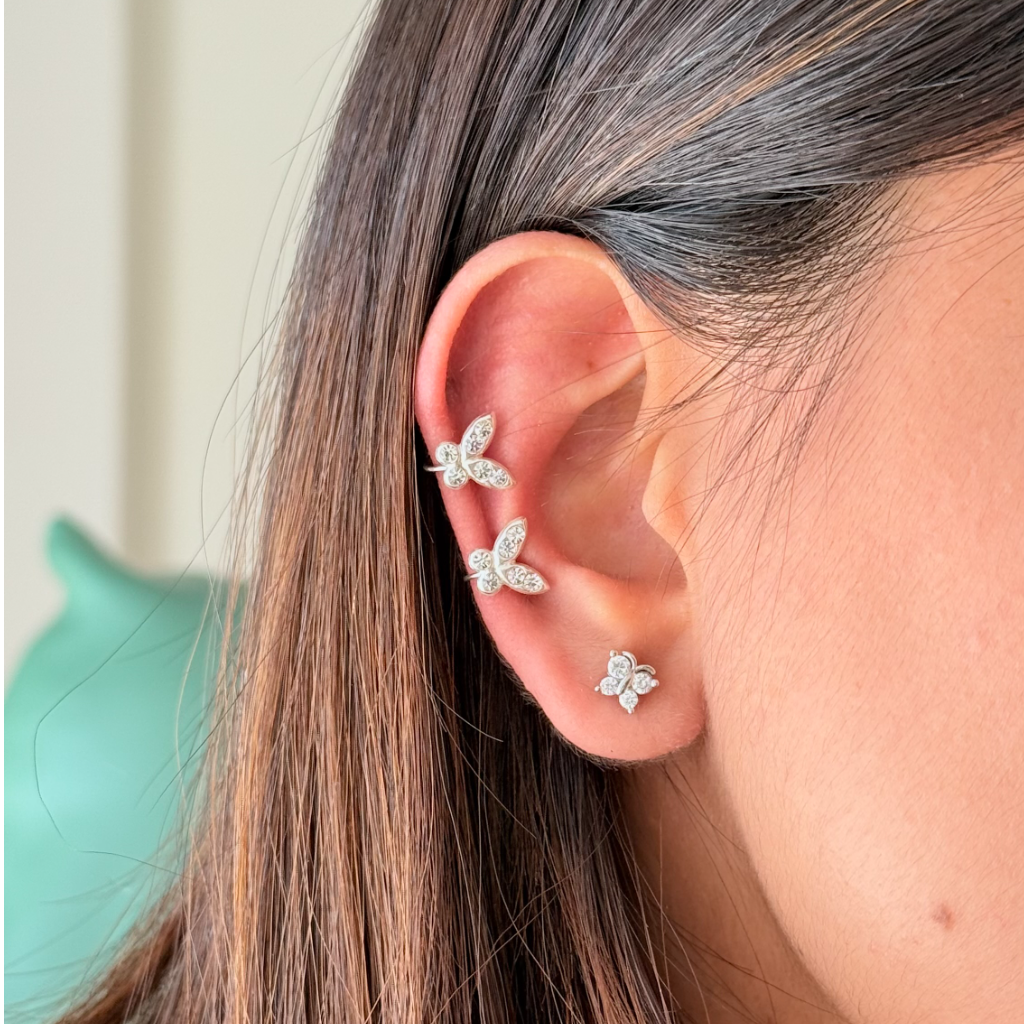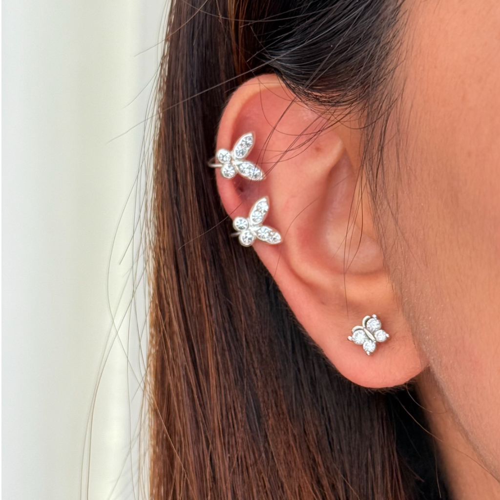 Let your style take flight with the Buttercuff Ear Cuffs. This enchanting pair features a delicate butterfly design sparkling with CZ stones, designed to sit gracefully on your ear without any piercing. It's a whimsical and glamorous way to elevate your ear stack.