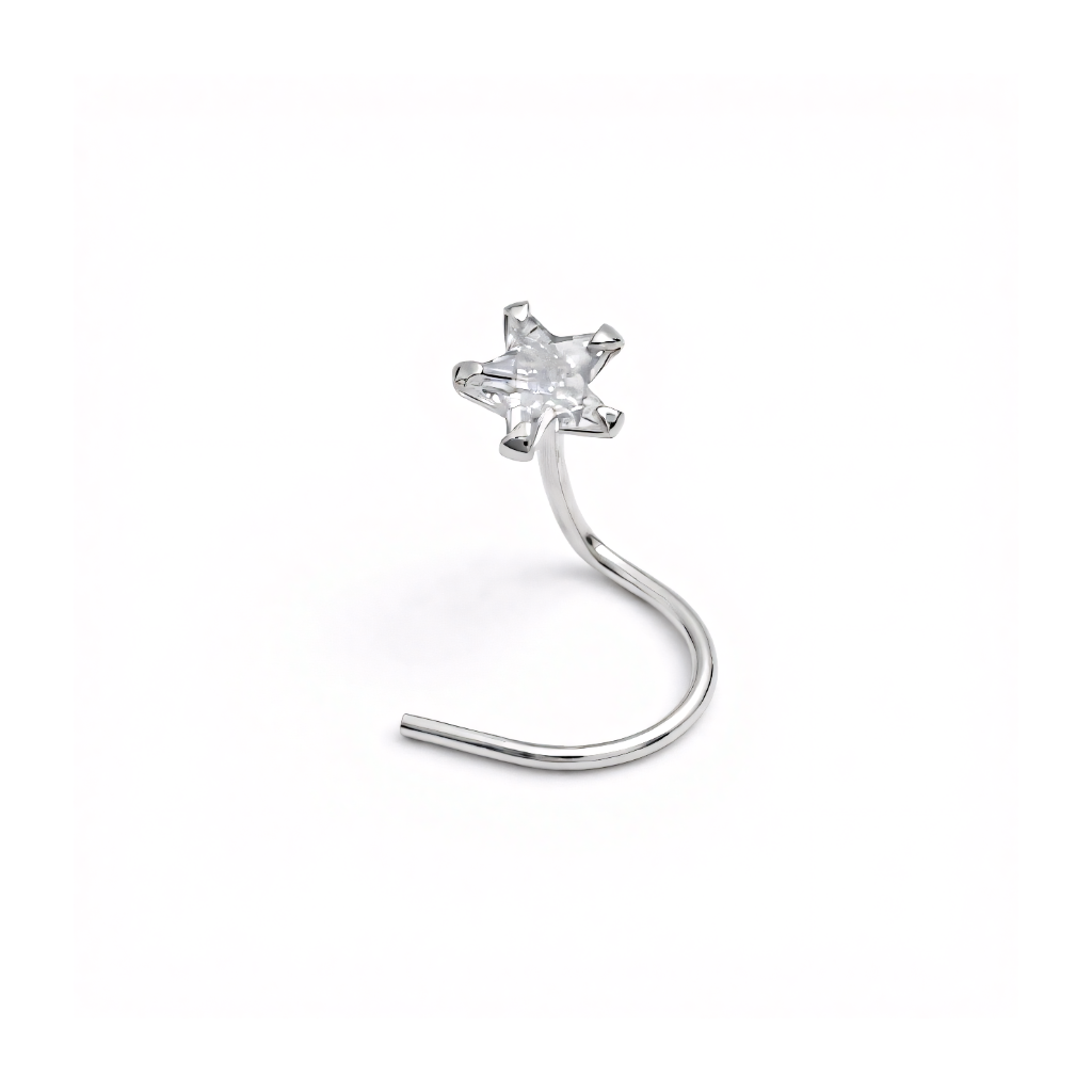 Let your inner star shine with the Aries Star Nosepin. This celestial piece features a beautifully formed star motif with two sparkling CZ stones for a subtle twinkle. The classic wire design makes it a comfortable and stylish choice for any pierced nose.
