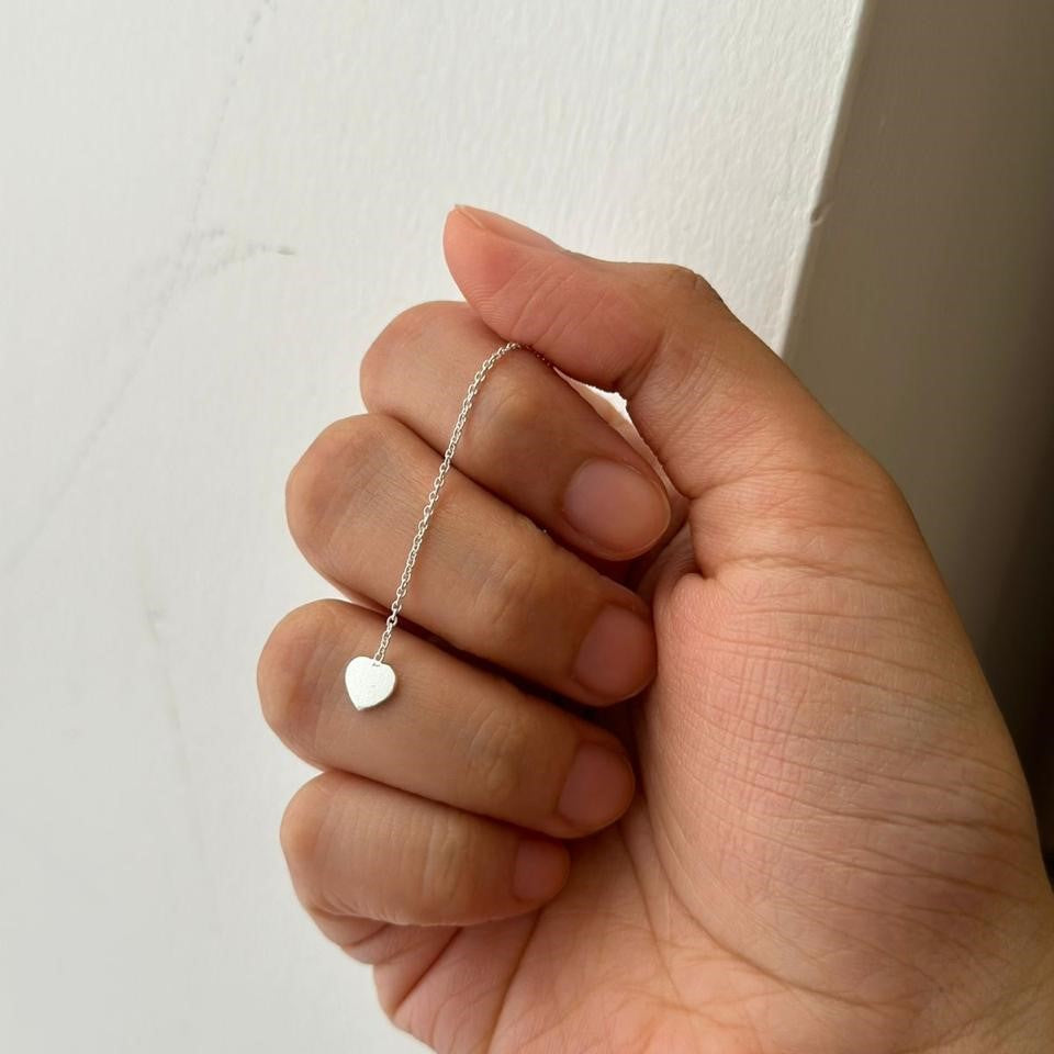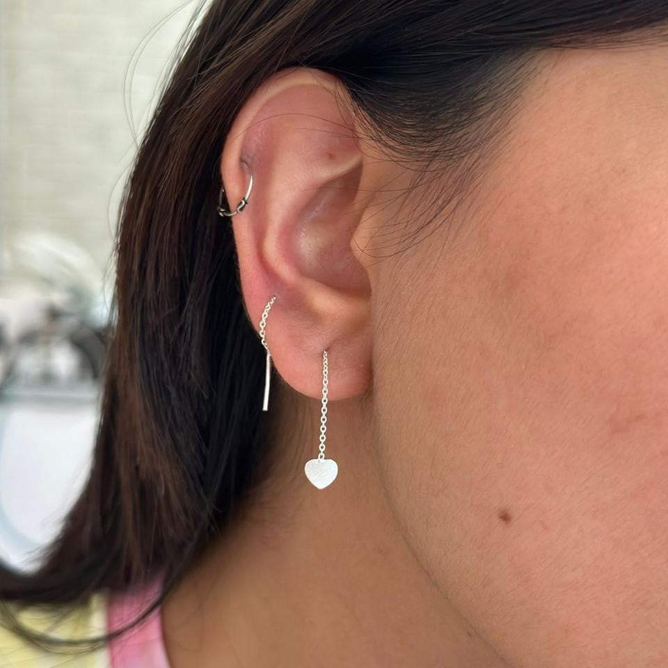 Add a touch of playful, modern art to your look with the heart shaped Threaders. This pair features a heart shape on a delicate thread-through chain. They are a unique and creative accessory for the modern minimalist.
